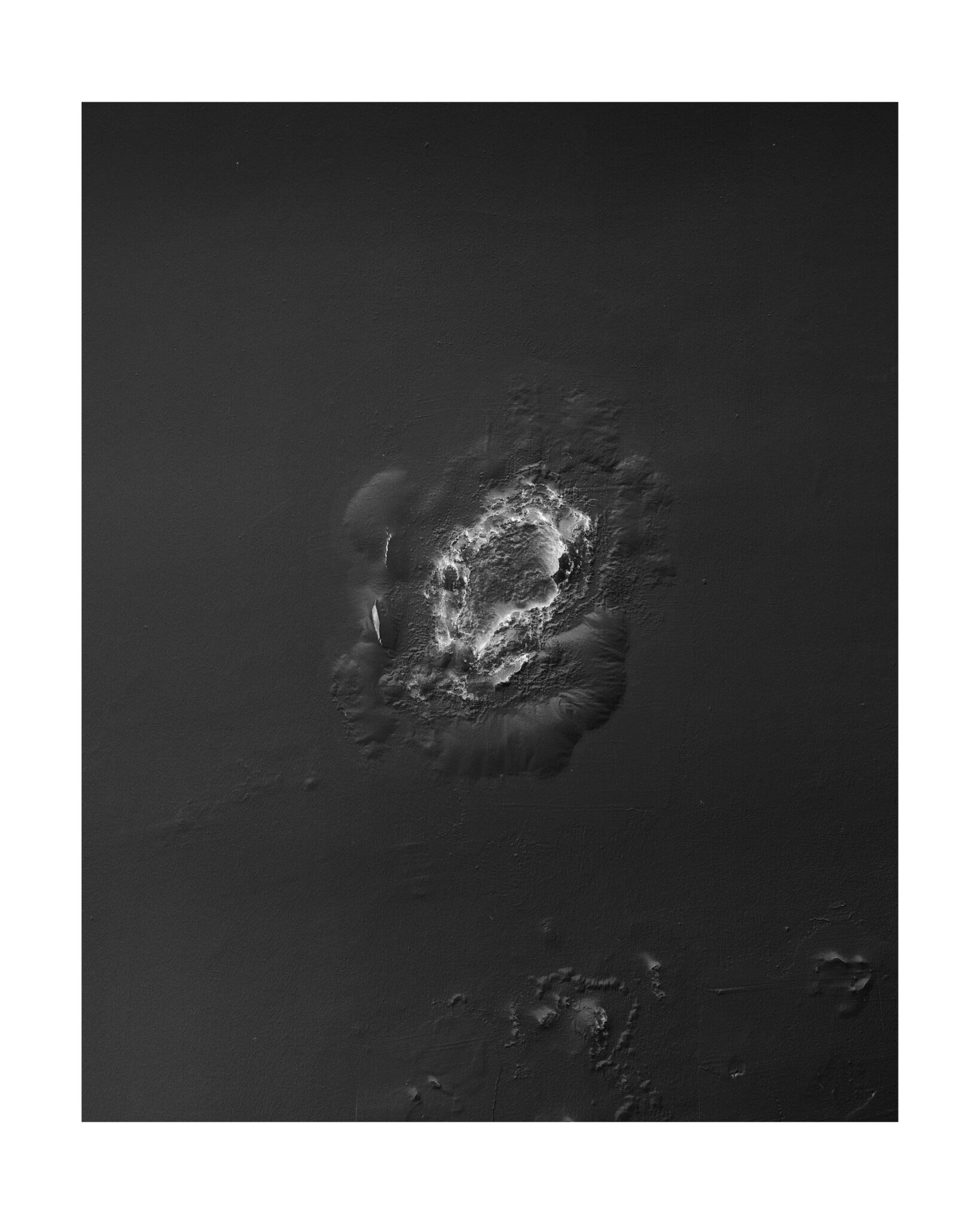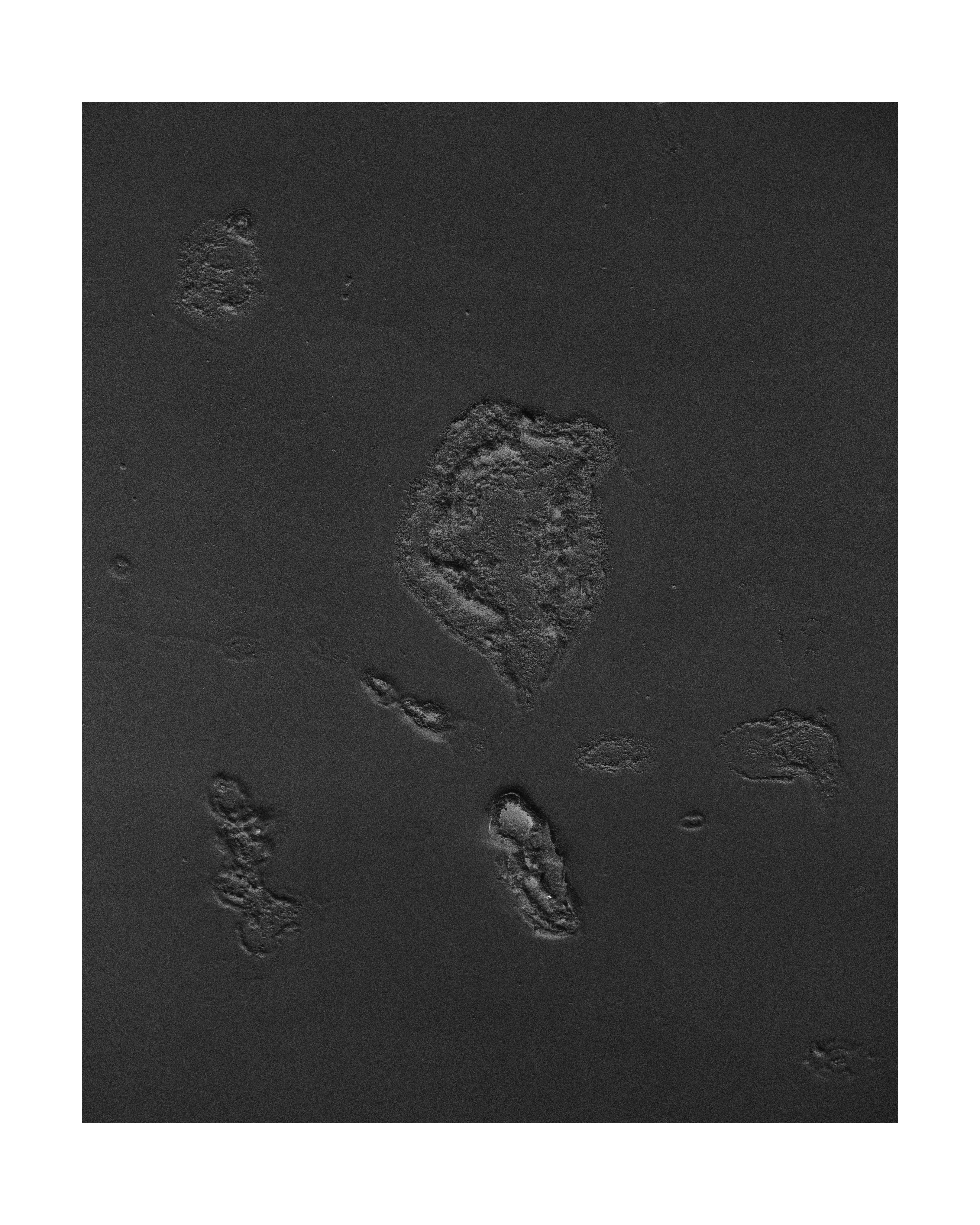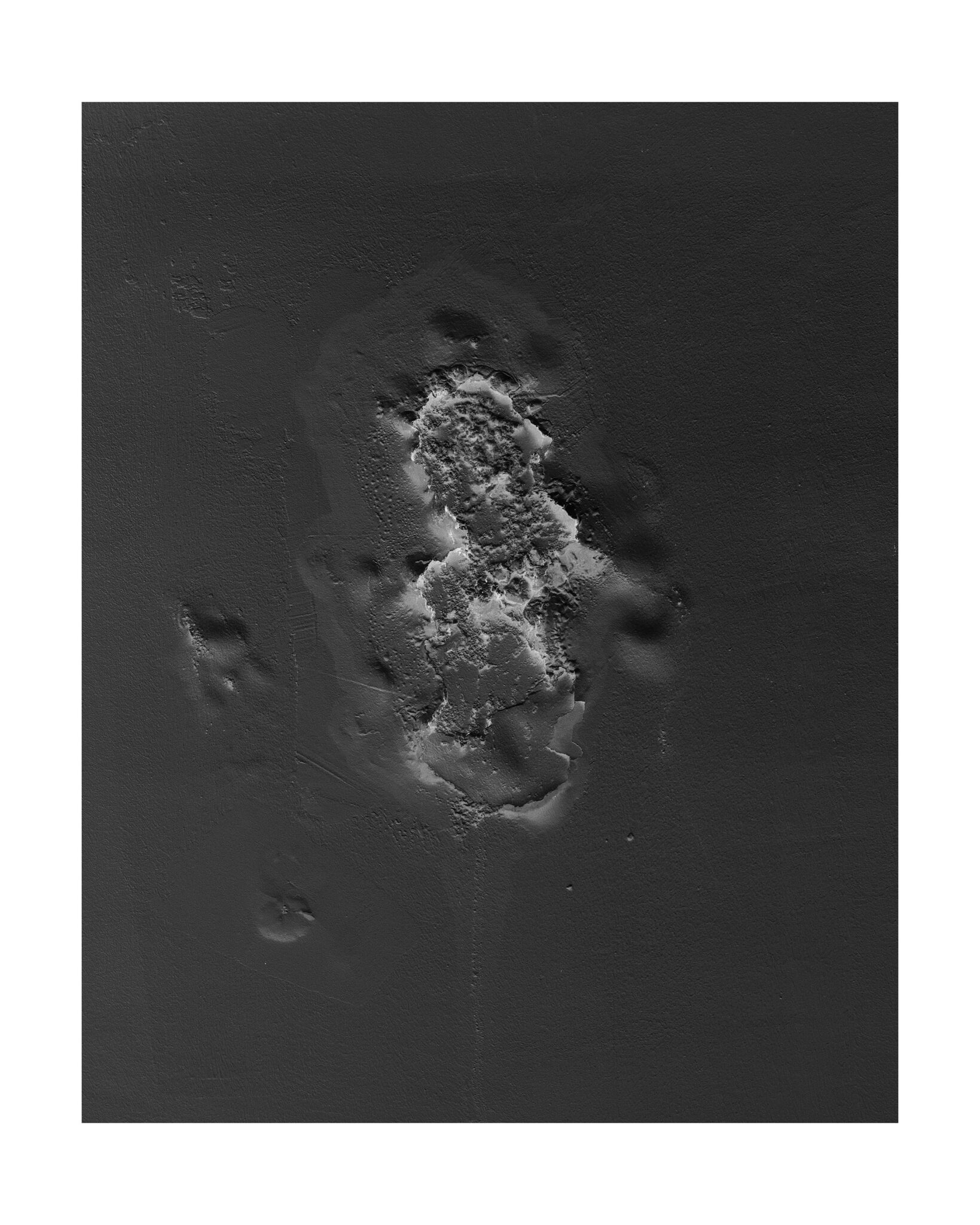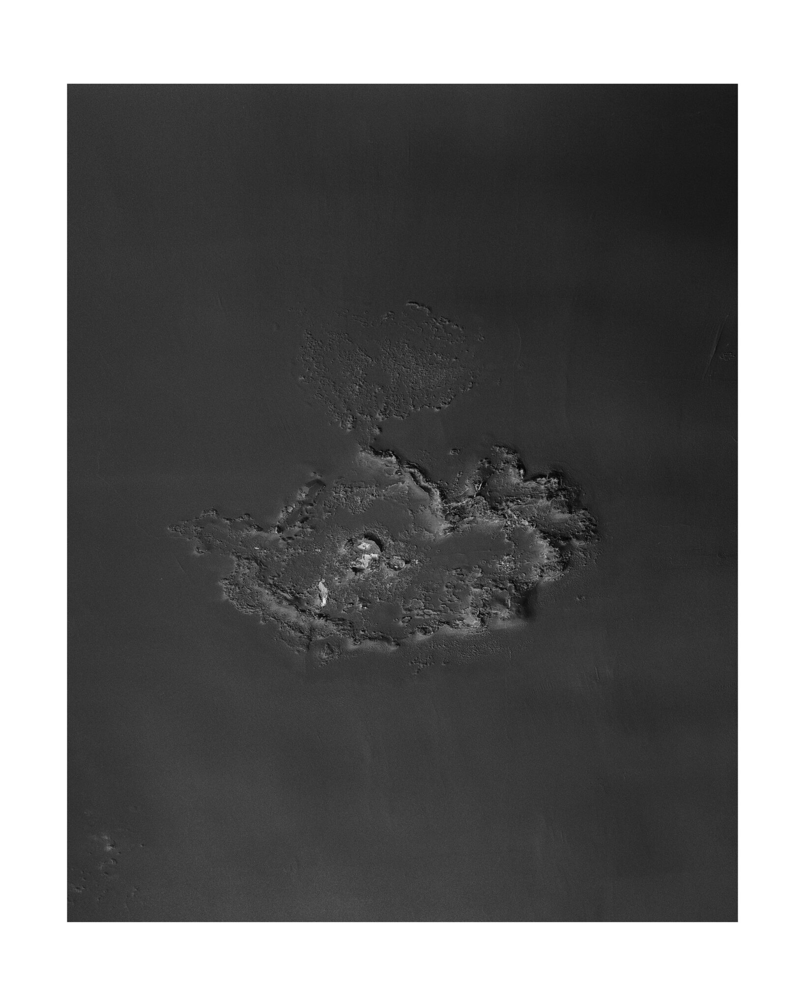 En parcourant les souterrains de la ville il part en quête de cette ile fantasmée et de ses consoeurs rocheuses: à travers des photographies de surfaces accidentées, où l’eau a percé l’épaisseur du sol jusqu’à atteindre les murs du métro , il invente un univers fait de récifs perdus dans l’océan. Art rupestre de l’imaginaire réinventé à même la peau des couloirs urbains, reliefs plâtreux et boursouflures exotiques d’une nature qui vient superimposer ses formes insulaires jusqu’à faire craquer l’écorce du quotidien.